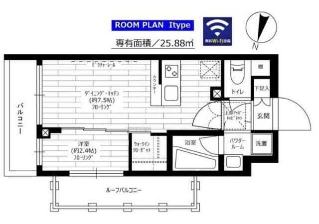 1DK ( DK 7.5帖 洋室 2.4帖 )